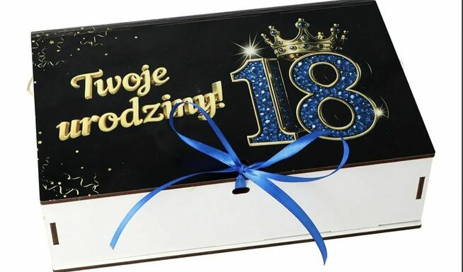 Eleganckie, czarno białe pudełko na prezent na 18 urodziny. Pudełko ozdobione jest złotym napisem 'Twoje ...
