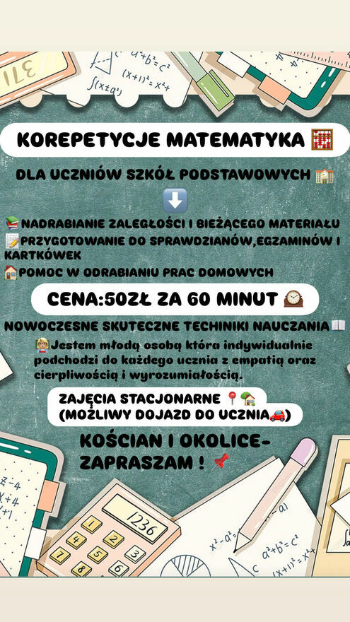 Witam. Oferuję korepetycje z Matematykidla uczniów szkół podstawowych.