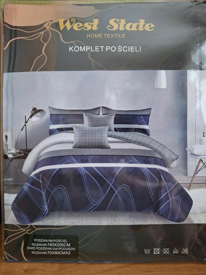 Nowa pościel w rozmiarze 160x200 cm. Zestaw składa się z 1 poszwy na kołdrę 160x200 i 2 poszewek na poduszki 70x80cm. Na opakowaniu nie ma podanego składu poscieli - w hurtowni podaǰą satyna bawełniana.Anna