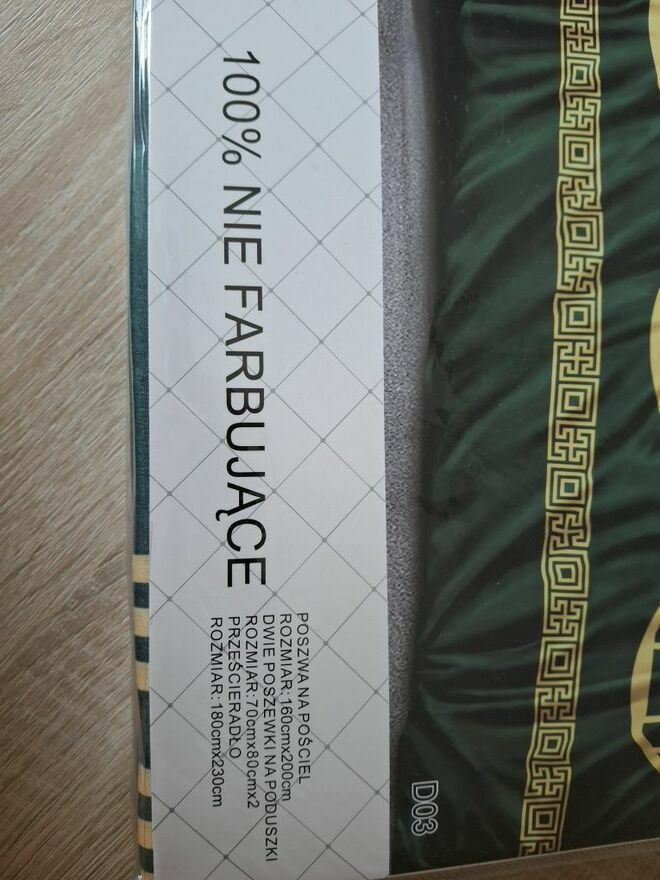 Nowa pościel o wymiarach 160x200 cm z prześcieradłem firmy Milano. Zielona pościel ozdobiona jest eleganckim złotym wzorem, tworząc stylowy i nowoczesny wygląd. Produkt doskonale sprawdzi się w sypialni, zapewniając komfort i elegancję. Pościel z satyny bawełnianej. Materiał miły w dotyku, nie jest śliski.Komplet zawiera